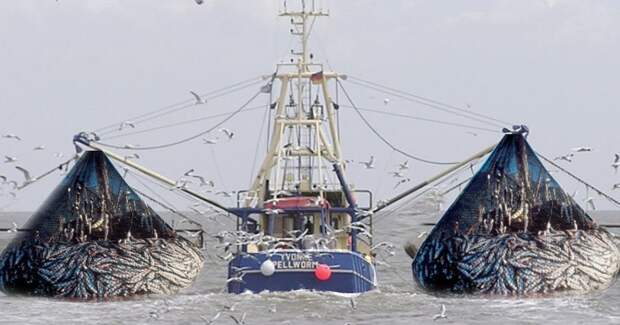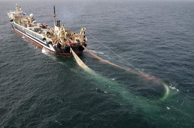 Супертраулеры - настоящие морские монстры по истреблению живности в океане. Огромные корабли длиной в 150 метров это по сути плавающие заводы, созданные для добычи и переработки рыбы гигантскими масштабами. Они могут неделями не заходит в порт, кидают свою громадную сеть на километр под водой, в эту сеть помещается 7 самолетов Аэрофлота.